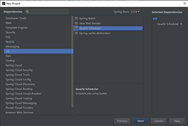 1. 新建SpringBoot项目时,选中Quartz,将自动添加Quartz依赖。