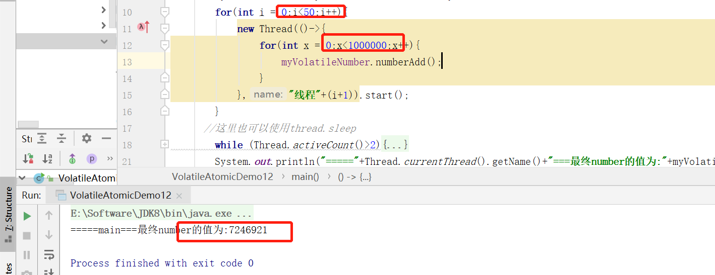 我们分别用10个线程执行100次,50个线程执行1000次以及50个线程执行一百万次来 | 线程数量 | 执行次数 | number预期结果 | 实际运行结果 | | 10 | 100 | 10*100=1000 | 1000 | | 50 | 1000 | 五万 | 49297 | | 200 | 1000 | 二十万 | 194181 | | 50 | 1000000 | 5千万 | 7246921 |
