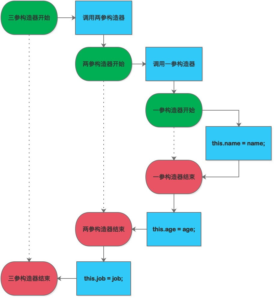 在上面的例子中一共定义了三个构造器,分别满足不同的初始化需要(当然,我们还可以定义的更多),但是可以发现很多赋值语句都是重复的,我们可以通过构造器互相调用的方式来减少代码量。在当前类中构造器进行相互调用,使用this()的方式来完成,括号中填入相应的参数,修改后代码如下。