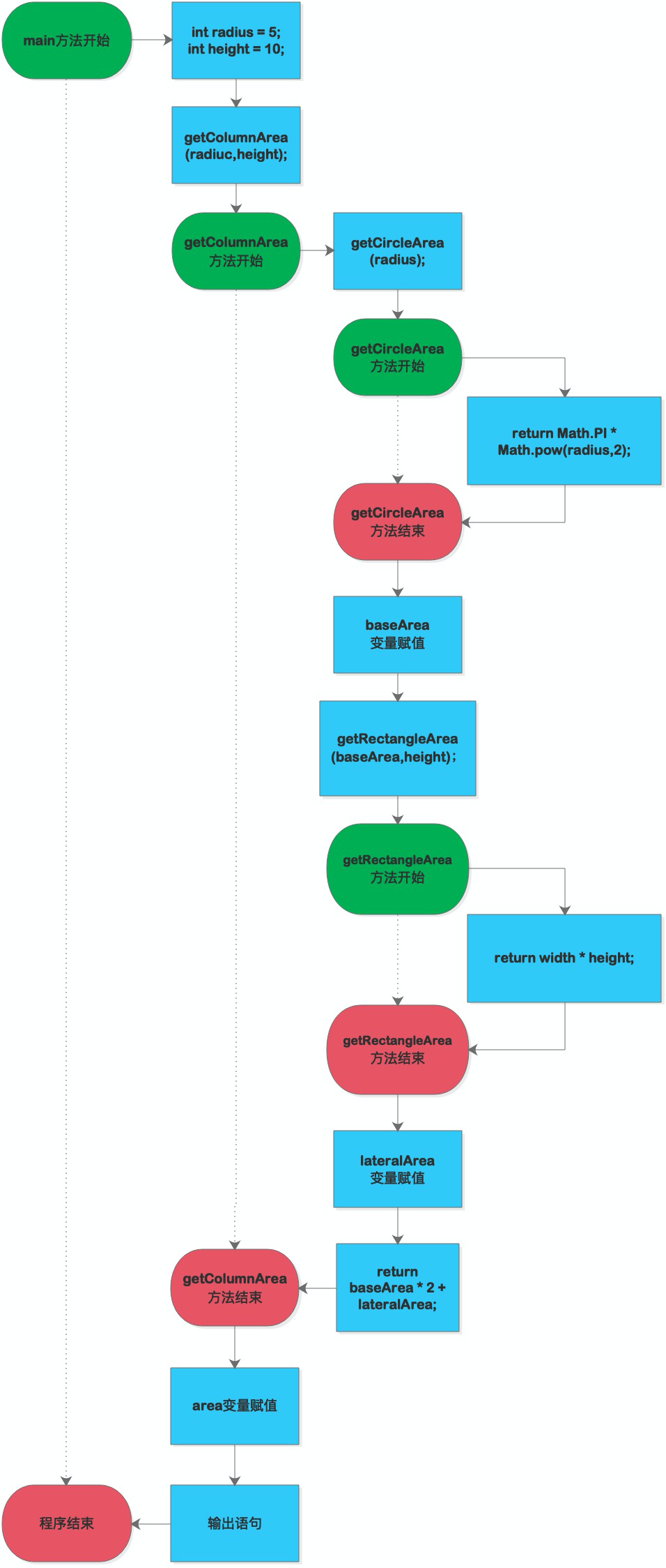 比如,我们已经有了两个方法:分别用于计算圆的面积和计算矩形的面积,如果我们现在需要算一个圆柱的表面积,我们还需要把整个方法重写一遍吗?当然不需要,因为圆柱的表面积的计算刚好可以通过两个圆柱底面积(圆)加圆柱侧面积(矩形)得到,我们只需要合理的传入参数和进行值的返回即可实现。
